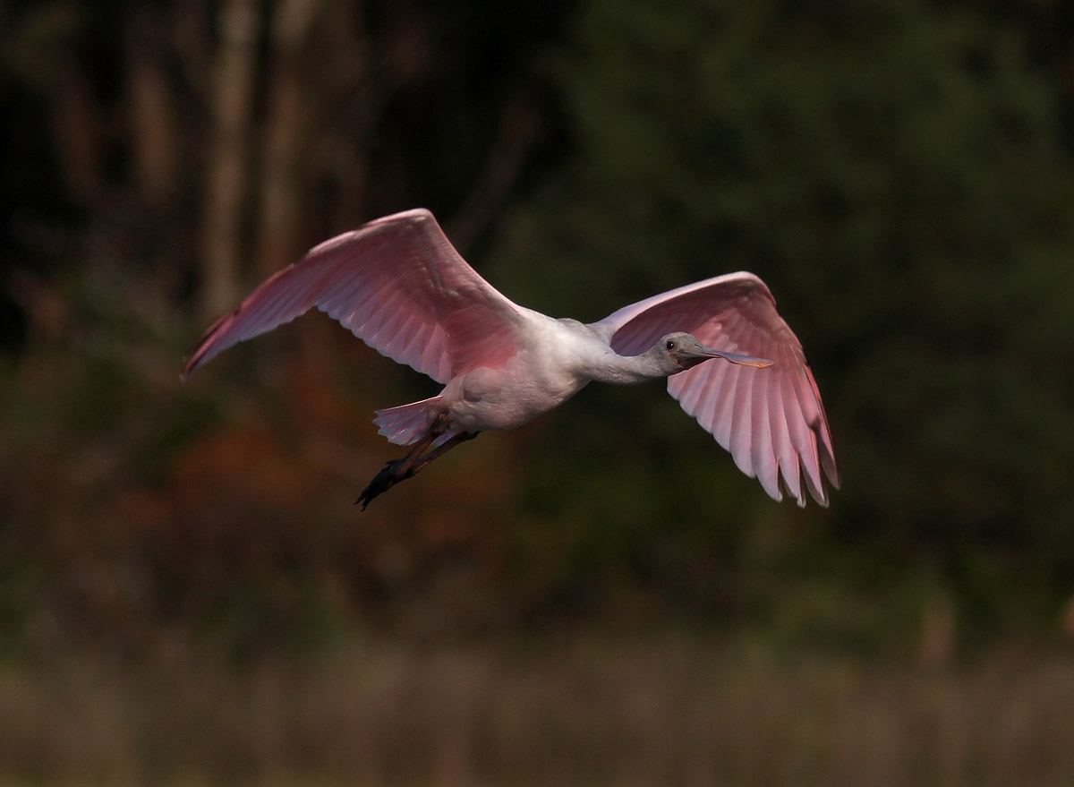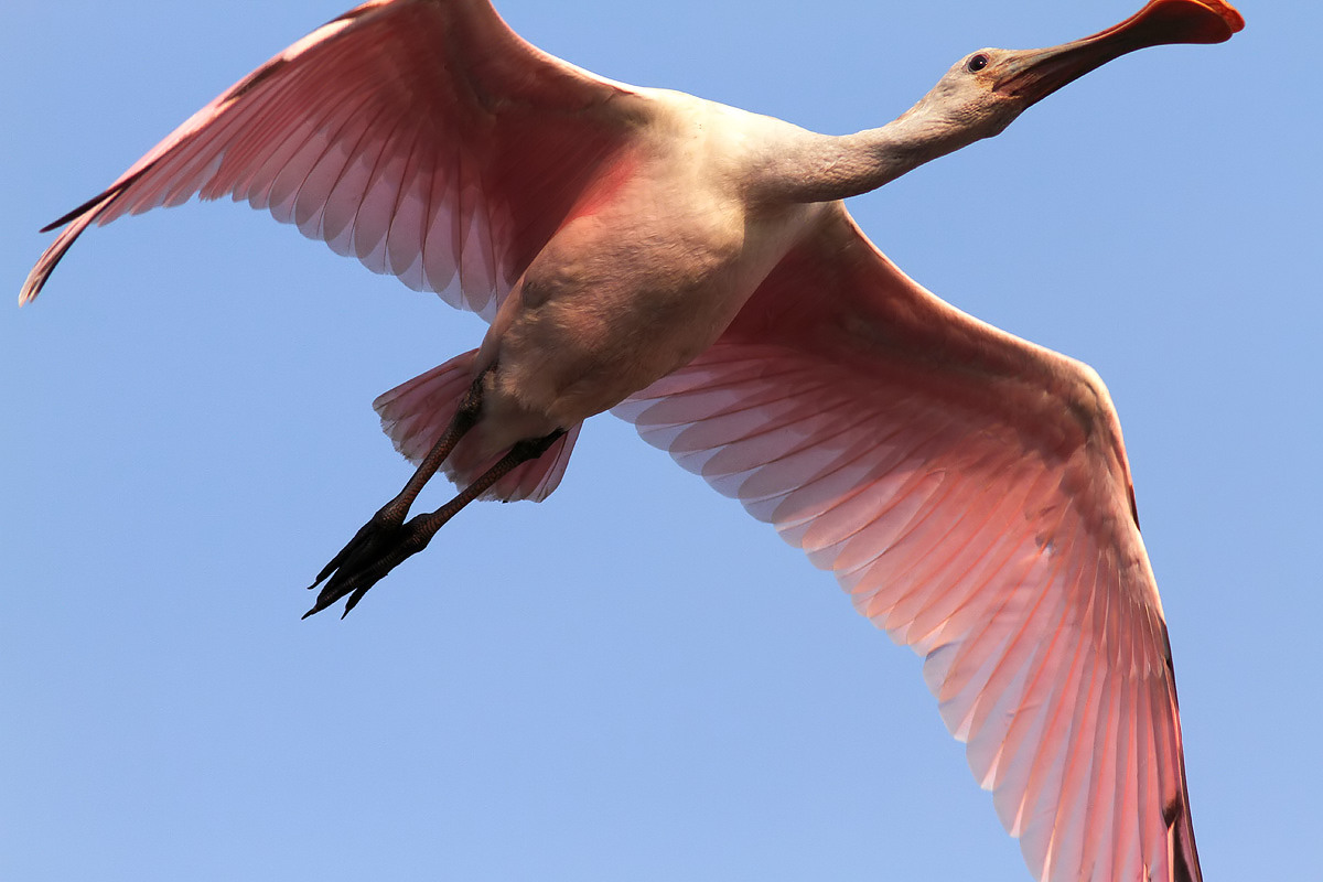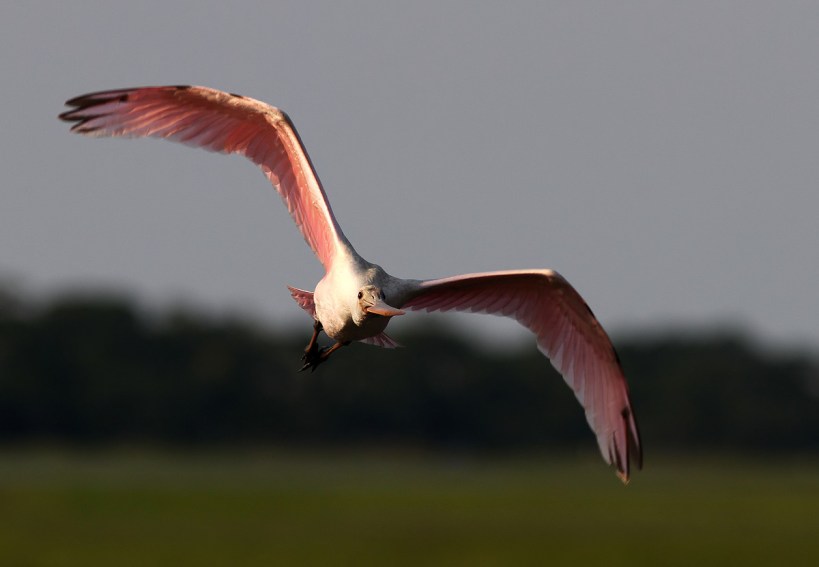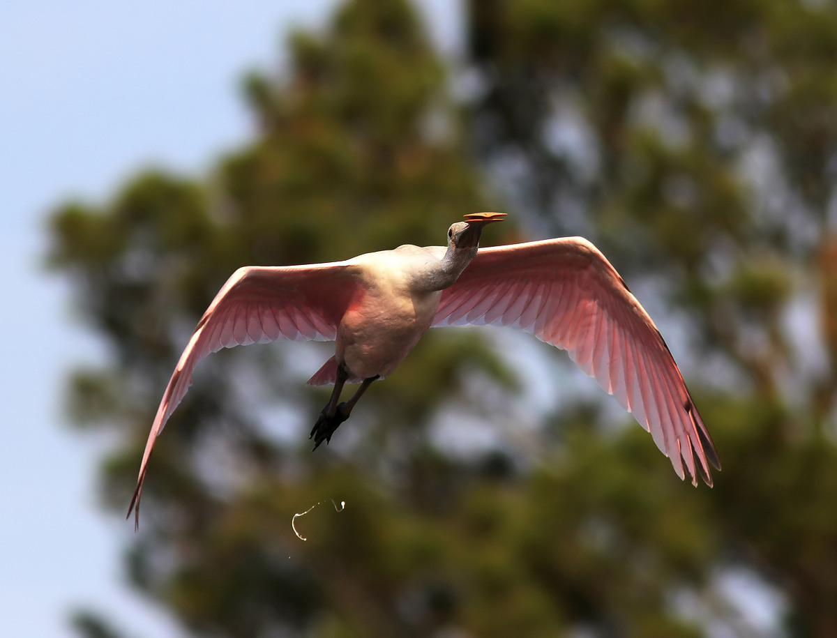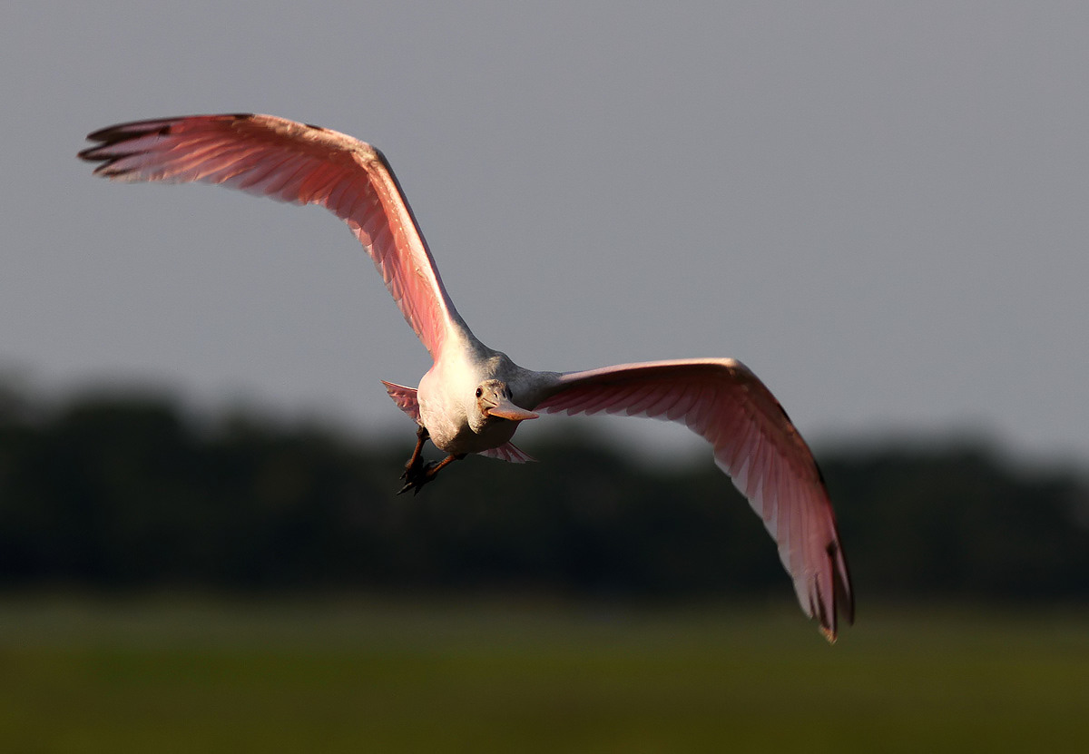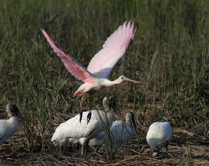 Yesterday evening we saw a Roseate Spoonbill hanging out with a group of Wood Storks in the salt marsh. We were hoping that it would decide to leave and give us some possible flight shot opportunities. Well after a bit, not only did it leave, but it also circled around us a few times putting on a bit of an aerial display. You may notice in the last photo that it also dropped a mid-air deposit as a parting gift!