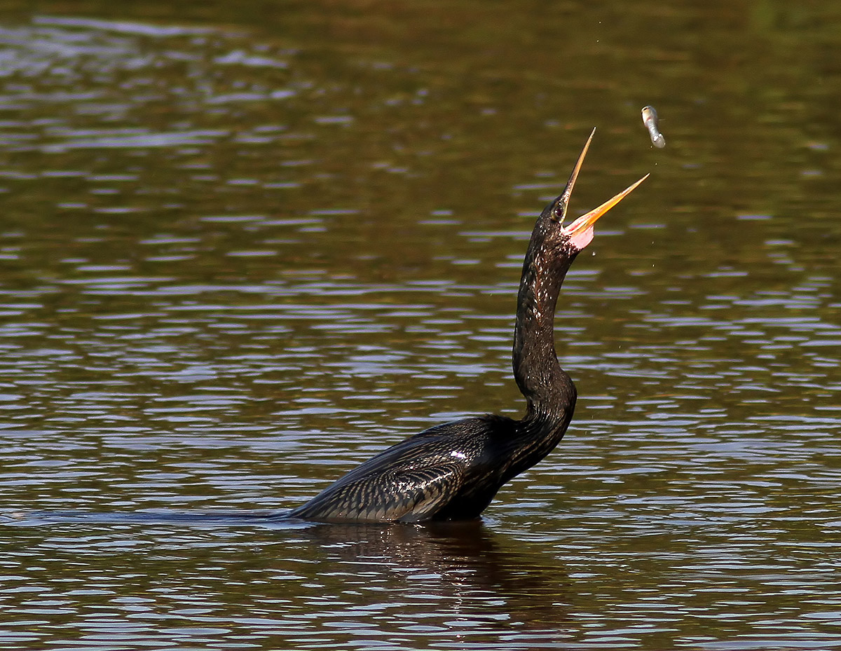 It then needs to shake the fish off it’s bill in order to eat it. So the anhinga will often flip the fish in mid air, catching it head down for easier swallowing.