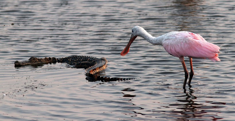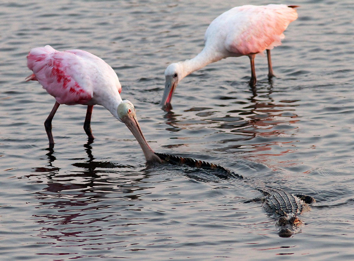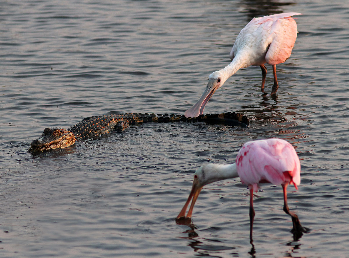 At one point they came upon a baby alligator. The little guy could not have been much more then three feet long. Well the spoonbills became fascinated with the gator, especially it’s tail. The spoonbills appeared to be reacting to the alligator almost the way a cat would to a dangled piece of string. Once the spoonies found the little alligator with the curious tail they would not leave it alone, even grabbing the gator’s tail and picking it up a few times. The alligator attempted to go about it’s business which was getting itself fed, but was also clearly annoyed at the unwanted attention. Finally the spoonbills lost interest and the alligator glided off to a less crowded area to continue feeding.