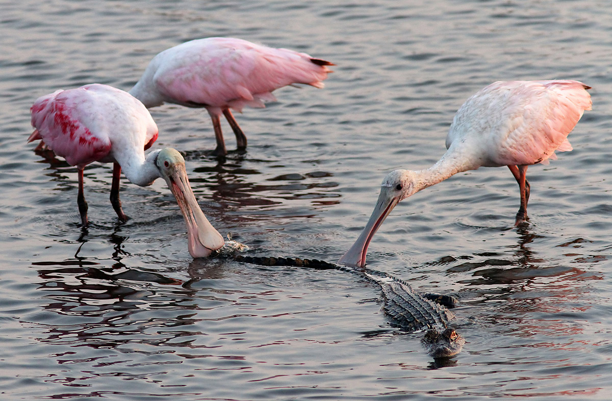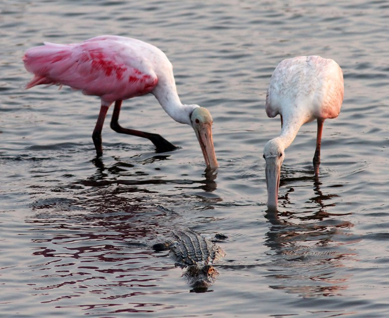 • I would have thought the little guy would at least snap at the spoonbills to try to make them stop annoying him, but maybe he felt outnumbered. 🙂