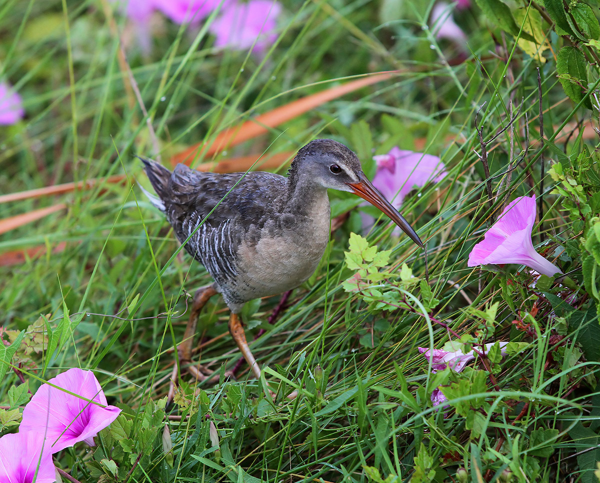 A clapper rail walks along the edge of the marsh pond among the Morning Glories this morning.