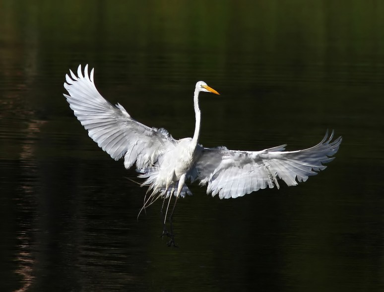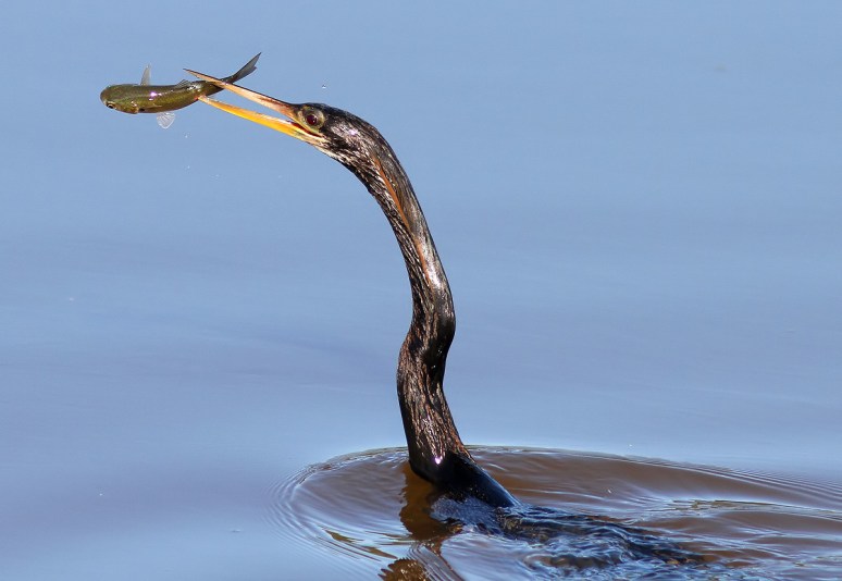 An anhinga had a little luck as well. The anhinga is a water bird that fishes by swimming under the water and spearing a fish on the end of it’s sharp bill. A snowy egret was utilizing a fly and fish technique which gets the water all boiling over with agitated fish. The nearby alligators seem to have the the same effect on the fish as well. Egrets were swooping around almost continuously which provided some interesting views of their landing techniques. The bald eagle also put in a much appreciated fly by over the pond. Always love seeing the eagles. Fun and interesting morning for sure.