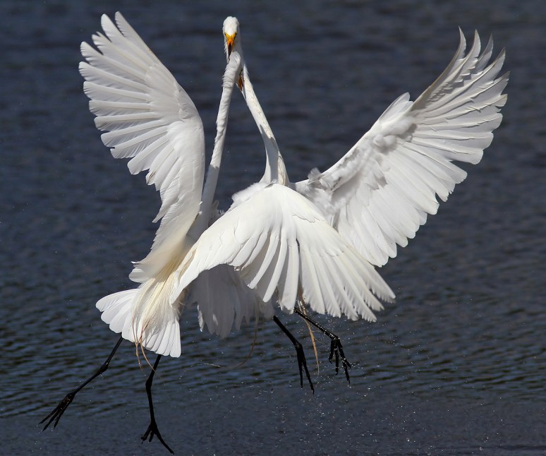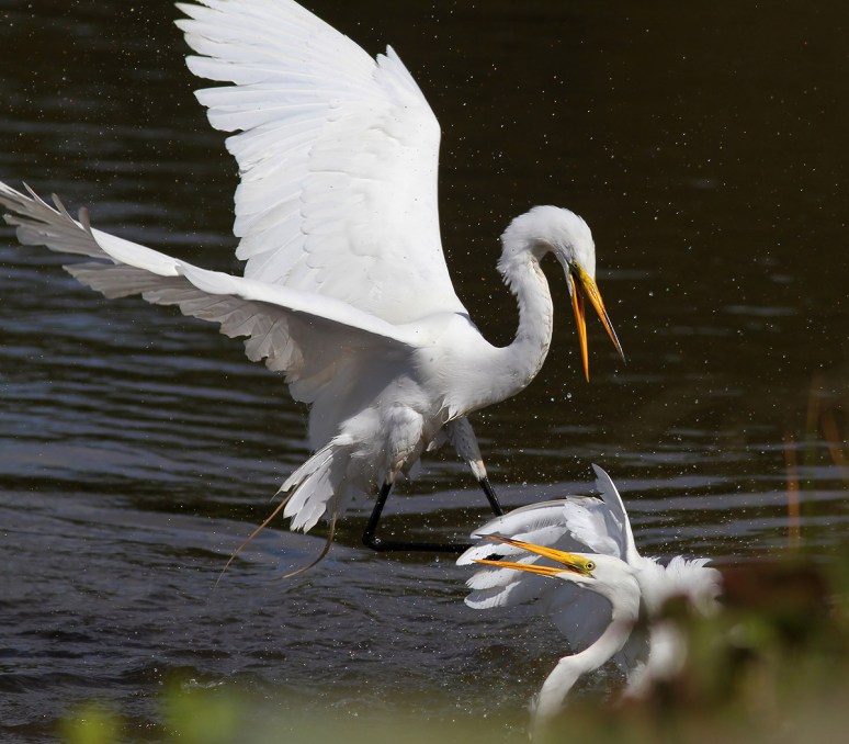 Great Egrets have been known to have disagreements with one another, especially around fishing areas. Sometimes a large group of them can all get along just fine. Other times there could be only two, and one will feel compelled to pick a fight with the other.