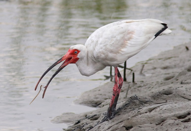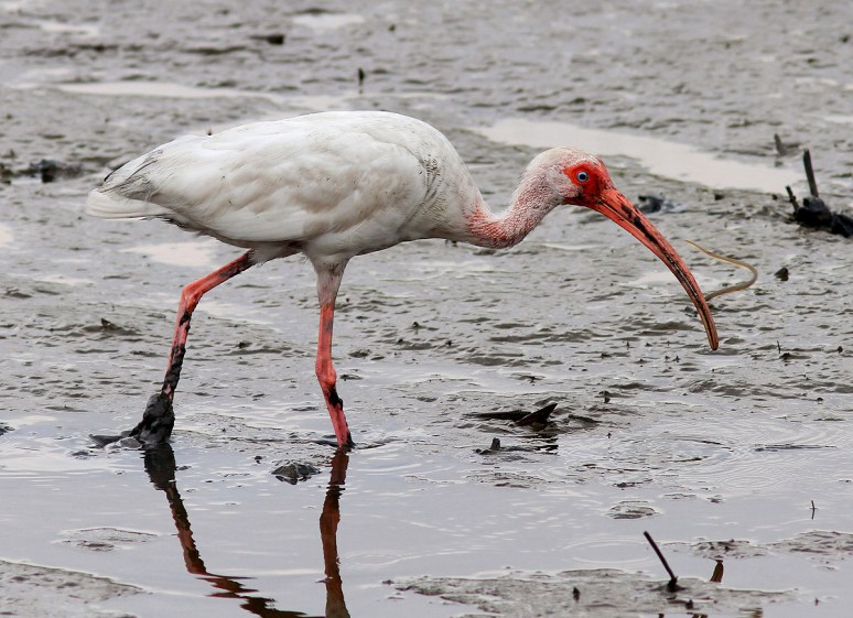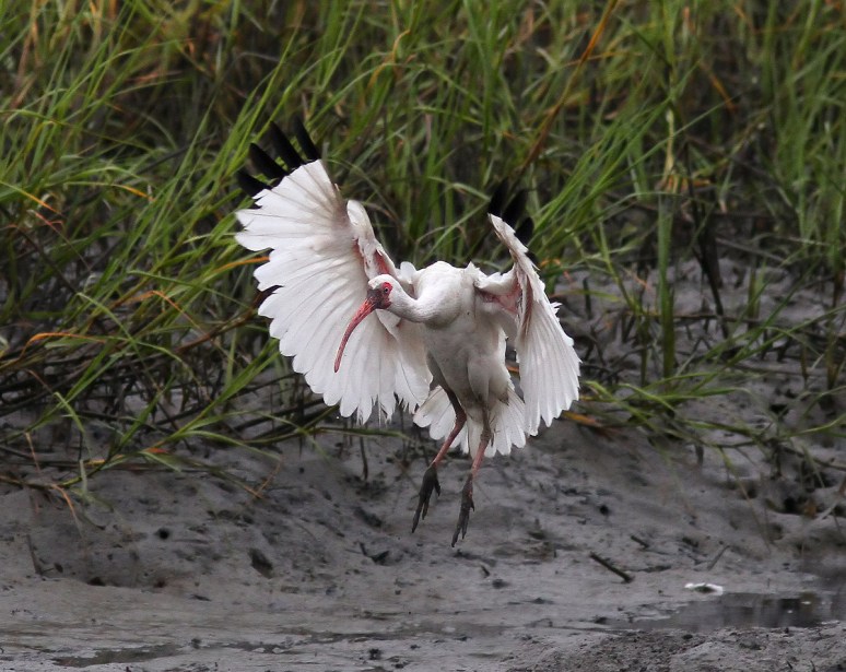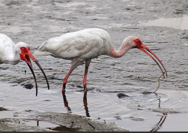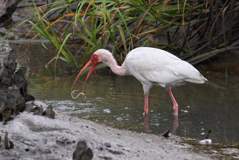 This morning we watched as several White Ibis landed in the salt marsh among the oyster beds at low tide and began feeding. The ibis use their long curved bills to poke around in the marsh mud in search of their favorite foods. This results in them getting very muddy faces and feet, which helps earn them the nickname Muddy Ibis. On today’s menu were the typical small crustaceans but they were also observed picking out lots of tiny eels.