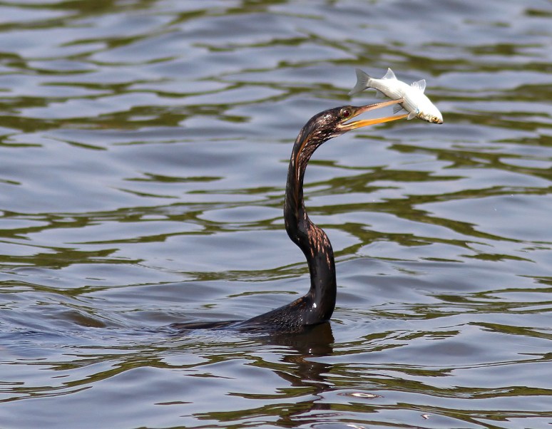 The anhinga is a water bird that fishes by swimming underwater and spearing a fish on the end of it’s very sharp bill.