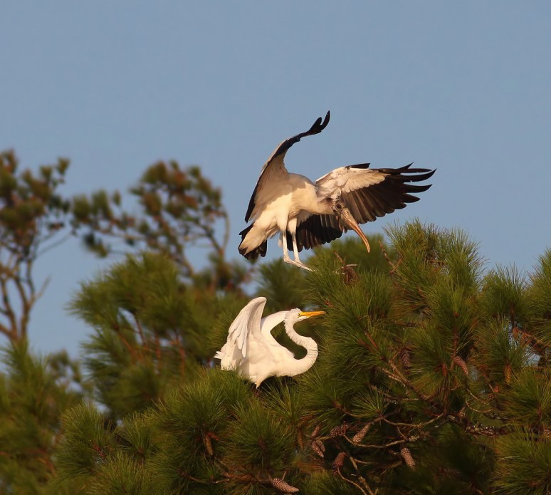 Suddenly a wood stork decided to just drop in on an egret that had been sitting peacefully, and practically landed on the egret’s head!