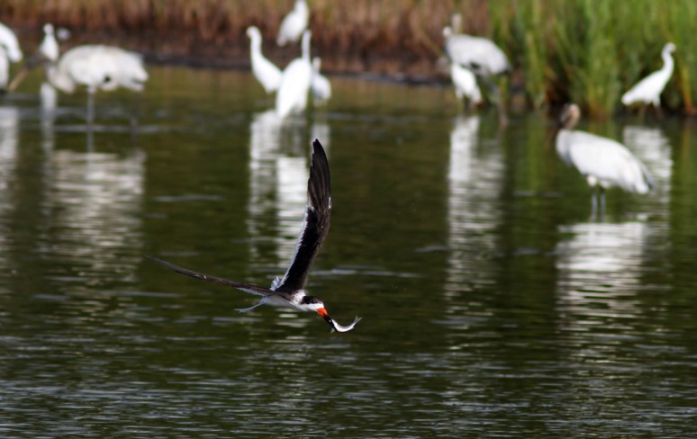 A while back we had the opportunity to observe some black skimmers operating in the marsh pond.