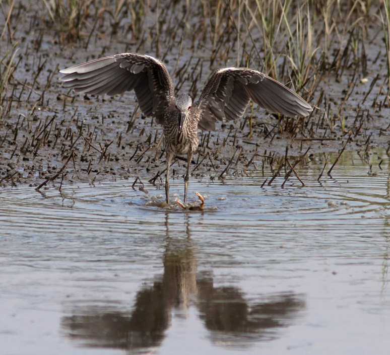 Well now the fight is on! The night heron has it’s wings raised up in full alert mode, and the crab is doing the same with it’s claws.