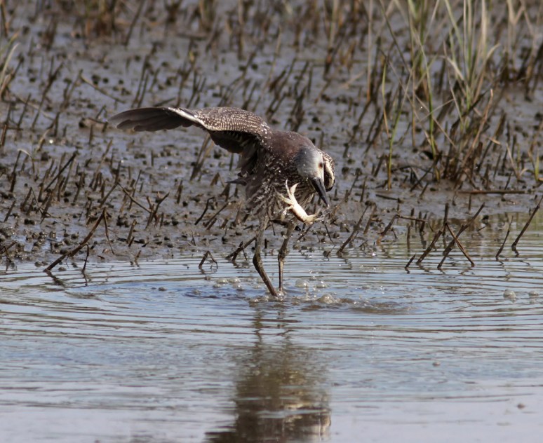 The night heron was suddenly very excited to find what he thought would be a quick and easy catch when he spotted this crab in the shallow water.