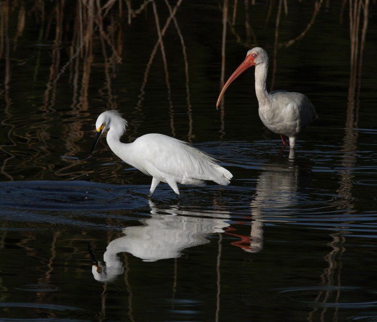 This morning we were watching a snowy egret and a white ibis who were feeding in the marsh.