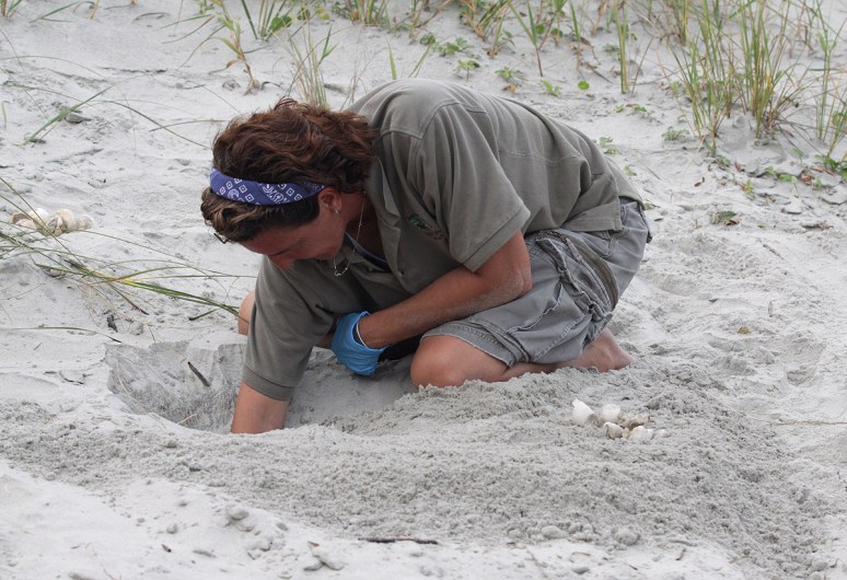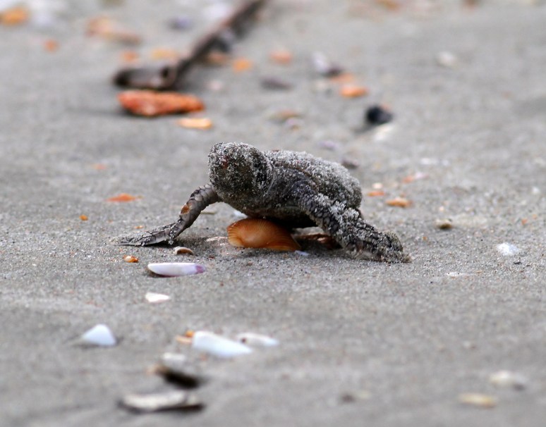 Yesterday evening was the last Loggerhead Turtle Inventory at the beach close to the marsh. It’s an amazing process to watch! Three days ago this nest hatched and now the naturalists can start the inventory. First, they carefully dig into the nest to count how many eggs hatched, how many eggs did not hatch and they also check to see if there are any live babies who haven’t climbed out yet. If they do find a live turtle, it is lifted gently out of the nest and placed on the sand directly facing the ocean…covered in sand it is then up to the little baby to find his own way to the water. The turtle’s eyes are very sensitive to light, and the light shining on the water is what guides it on it’s first steps to the ocean.