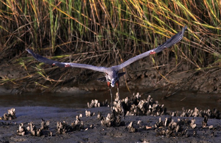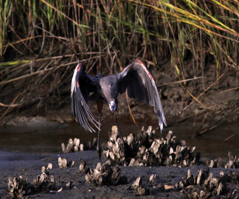 Last night while I was watching and photographing the changing sky and clouds, I heard the familiar squawk of a great blue heron behind me. When I turned around there he was flying in just barely above the reeds toward me, finally landing on the oyster beds in the salt marsh. After staying a few minutes he took off and headed toward the trees to roost for the night. Another day transitions into night in the marshland!