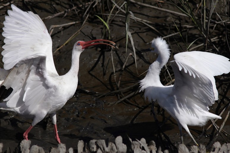 Yesterday we were watching a small group of snowy egrets and white ibis picking around in the salt marsh among the oyster beds at low tide. Everything started out quietly enough, but whenever snowys are involved we all know that the peace can’t last for long. Sure enough, once a snowy decided that an ibis was getting too close to his “area”, the inevitable squabble broke out! After the usual amount of squawking, bill banging and required display of wings, they went right back to the all important task at hand which was feeding…of course in this crowd the peace only lasts until the next disagreement breaks out!
