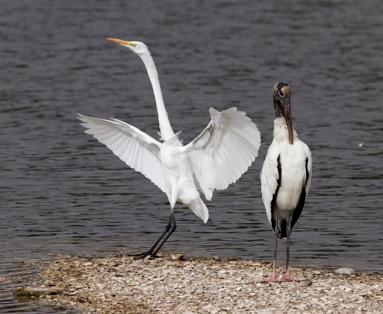 This past weekend we saw an egret come in for a landing in an area already occupied by a wood stork. But as you can see, Woody didn’t mind the new arrival at all. In fact, he barely flinched as the egret came swooping in…he seemed to have something important on his mind!