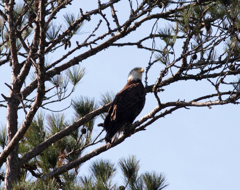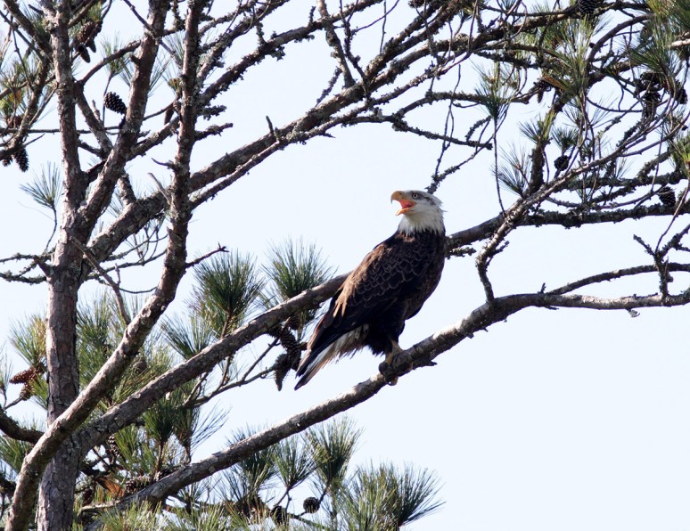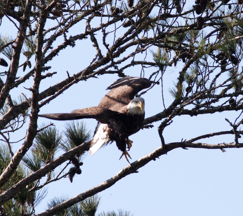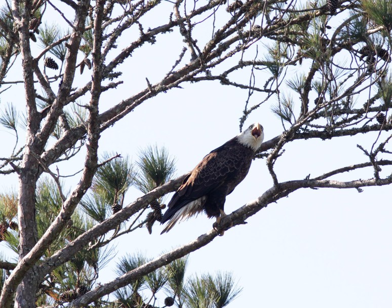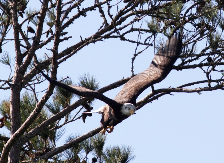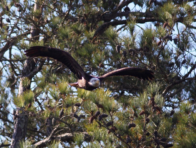 On Sunday morning we saw a bald eagle fly across the marsh and land in a pine tree in the distance. We had a general idea of where he’d gone and decided to see if we could find the exact tree so we could set up nearby in hopes of getting a flight shot if he took off. Well…we managed to locate the eagle and had a pretty good vantage point for taking photos. At one point he seemed to be calling for one of his friends, but…no one showed up. This may have given him the idea to go off in search of his friend because he abruptly left the pine tree and took a low swoop right at us and almost directly over my head! What an amazing sight on a beautiful Sunday morning!