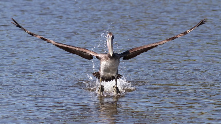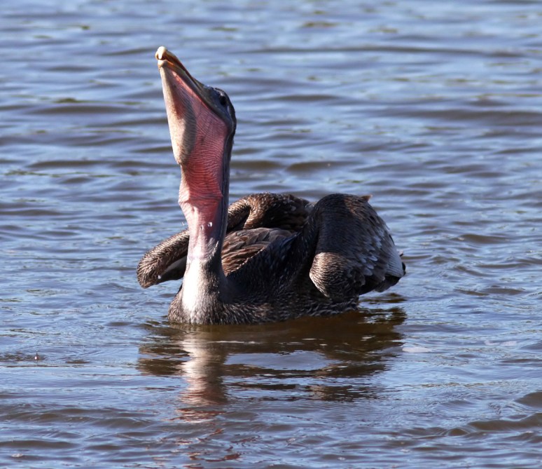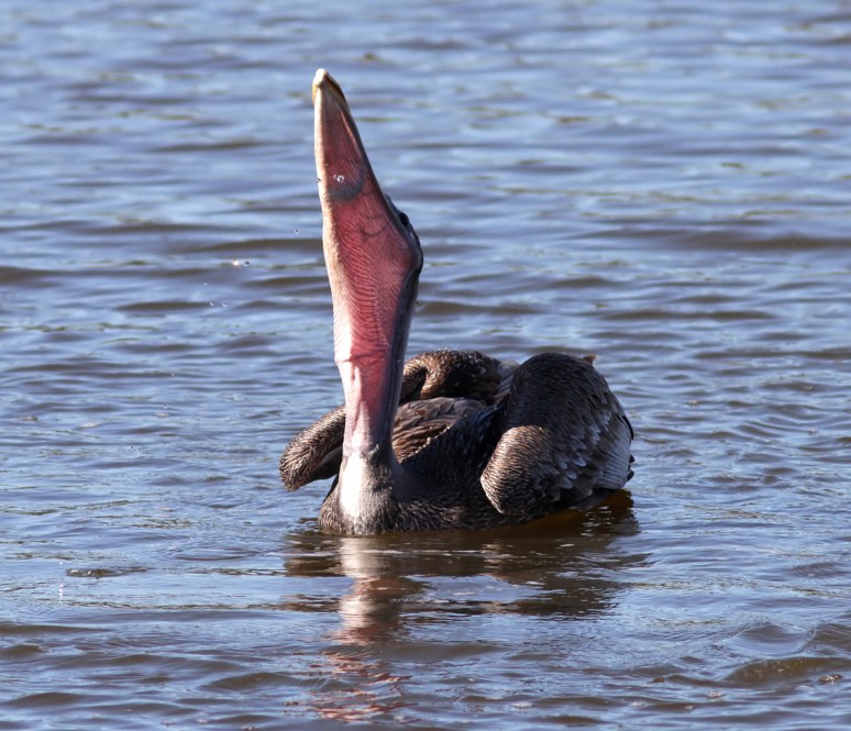 This morning we watched several brown pelicans fishing in the marsh pond. They can be very entertaining to watch. When they fish, a pelican hits the water with a huge splash and looks like it was just tossed out of a moving vehicle. But their fishing style works quite well for them as you can see…down the hatch goes the fish for a nice morning snack!
