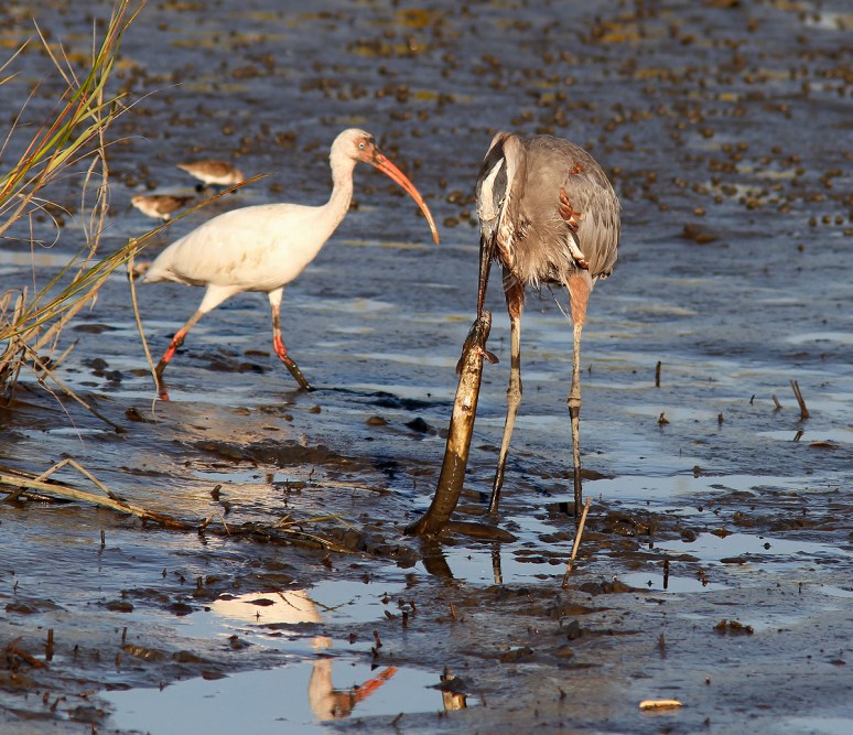 What was amusing was the other bird spectators that would show up at various times to witness the event in apparent amazement. Assorted ibis, egrets and an extremely curious wood stork all stopped by to watch. Eventually the blue heron took the eel back into the marsh grass for privacy where I could barely see it, but to my astonishment he finally managed to swallow the eel down!