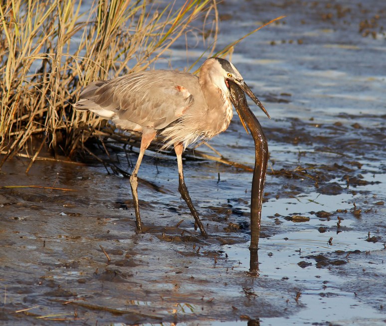 The heron had grabbed an eel the size of a baseball bat out of the salt marsh during low tide. I watched it battle with the eel for close to an hour never knowing if it would really try to swallow this huge eel or end up leaving it. Many times I thought the bird had given up, it appeared to be exhausted, but he clearly wanted that eel very badly. The problem with swallowing something this large was the sheer weight of the eel. Since the birds don’t have any teeth, each time he tried to bring the eel up to get it position to swallow, the eel’s weight would cause it to slip and drop right back down into the mud.