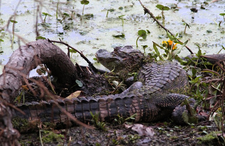 Yesterday afternoon, despite it being a kind of dark and dreary day, we went over to the swamp to see if anybody might be hanging around. We quickly spotted this baby alligator lounging on a mud bog near the edge of the swamp. The camera angle may be deceiving and make it look bigger, but this little guy was barely two feet long. If you notice the pretty yellow flowers near his head you can get some idea of how small he is. A bit further out in the swamp we saw another young gator come slowly gliding by. This one was a four footer and one we still consider being in the “baby” catagory!