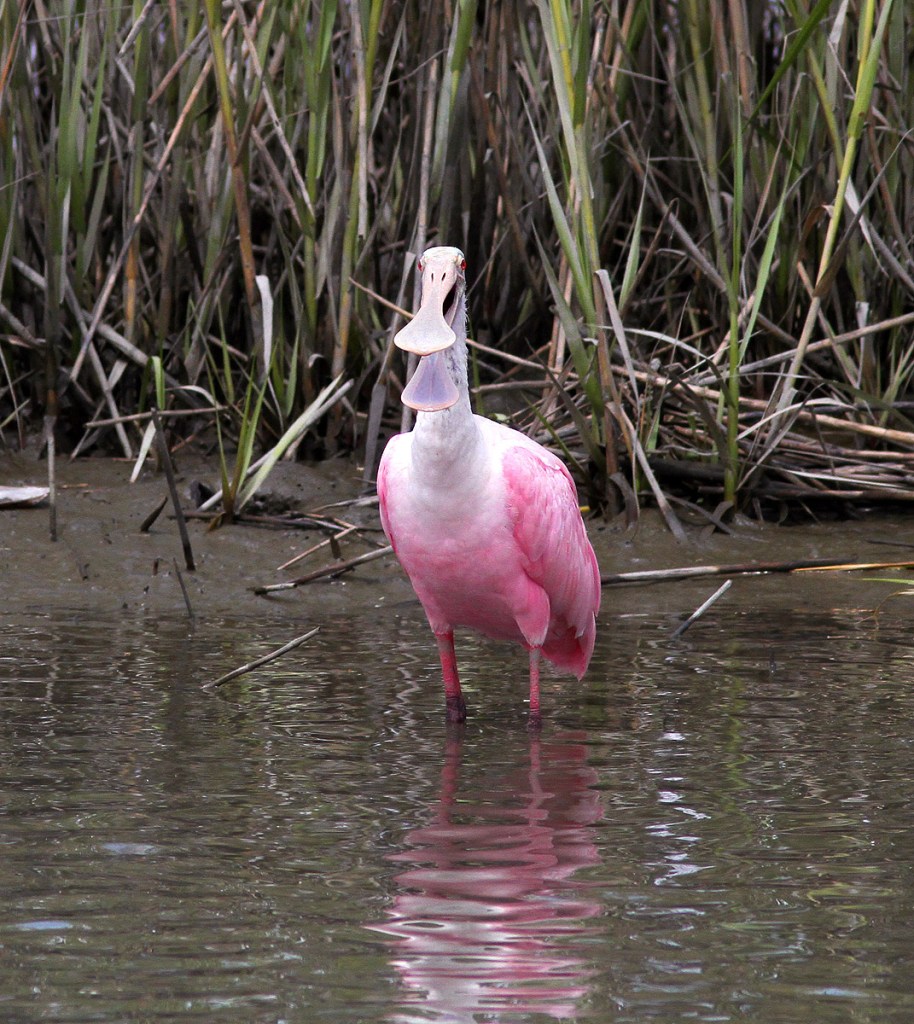 Spoonbill Lands on Tree Stump