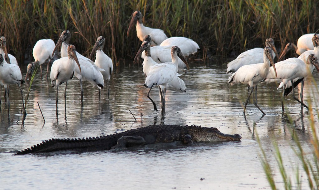 Alligator and Wood Storks