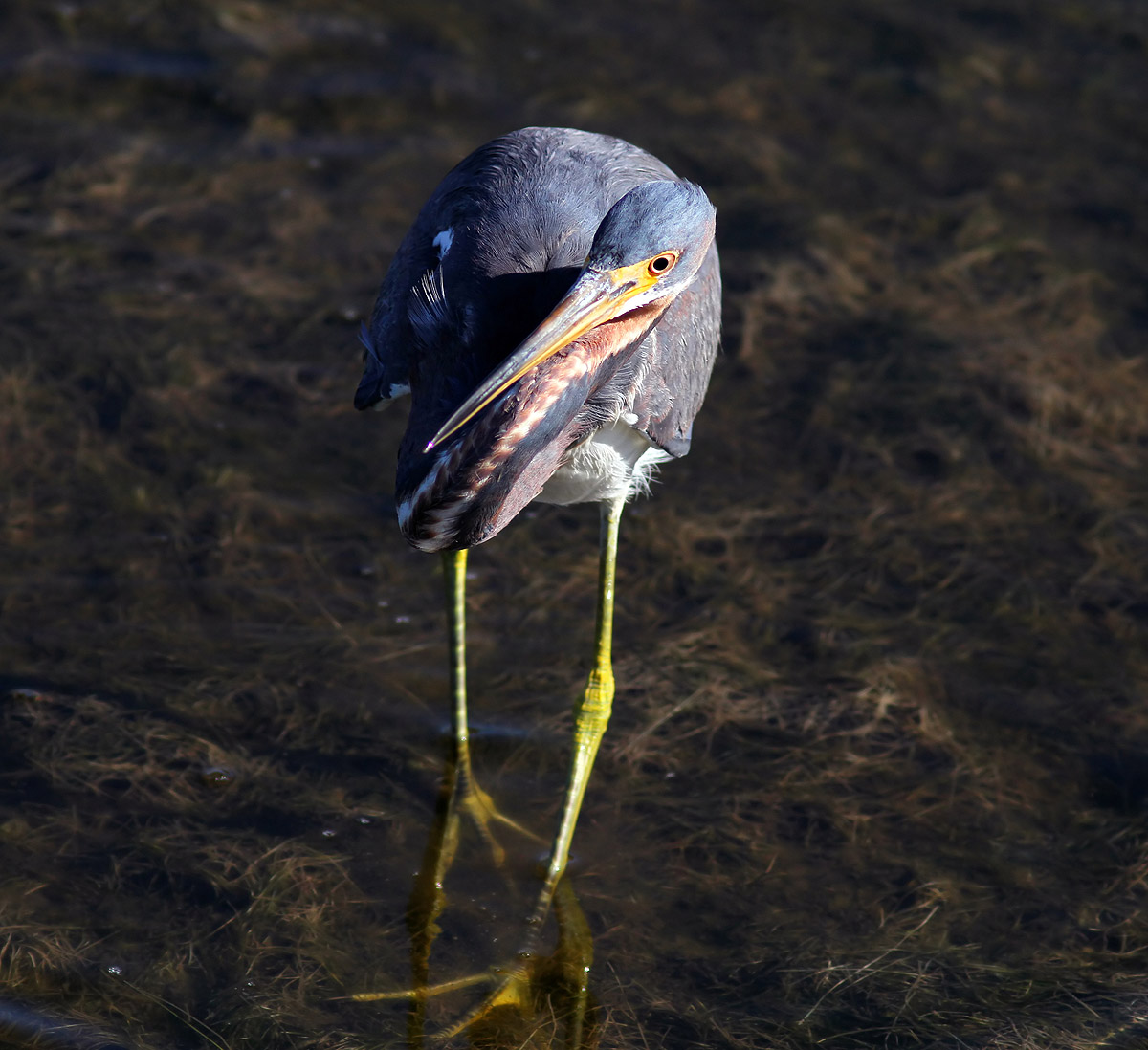 Tricolored Heron Fishing in Marsh Pond