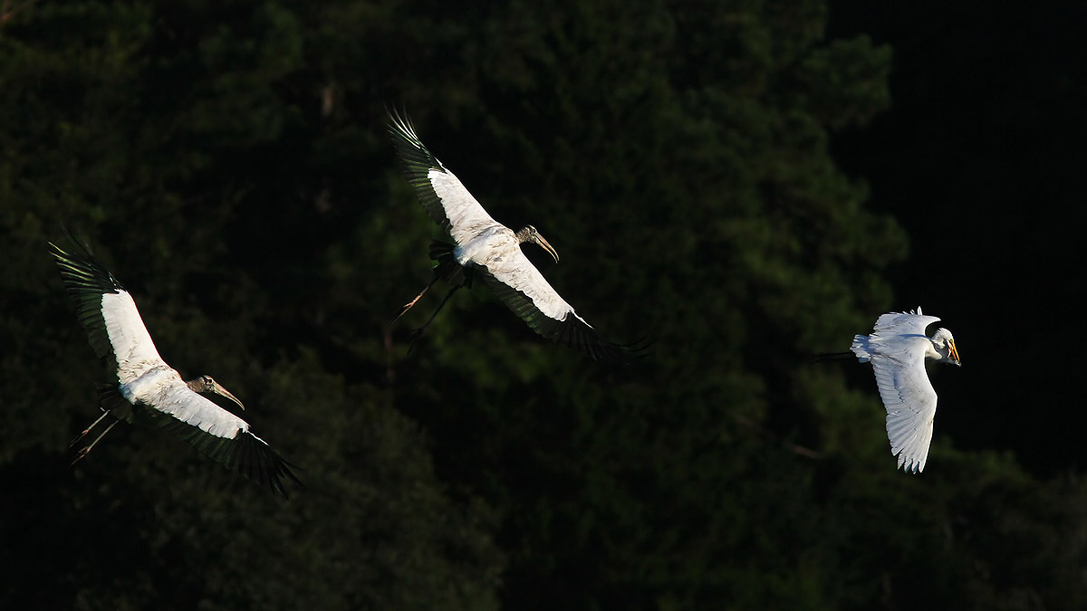 Wood Storks Chasing Egret