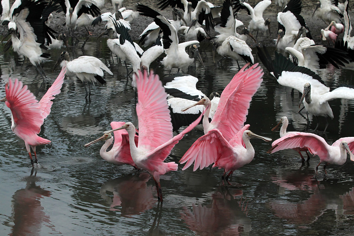 Spoonbill Wood Stork Crowd Explodes
