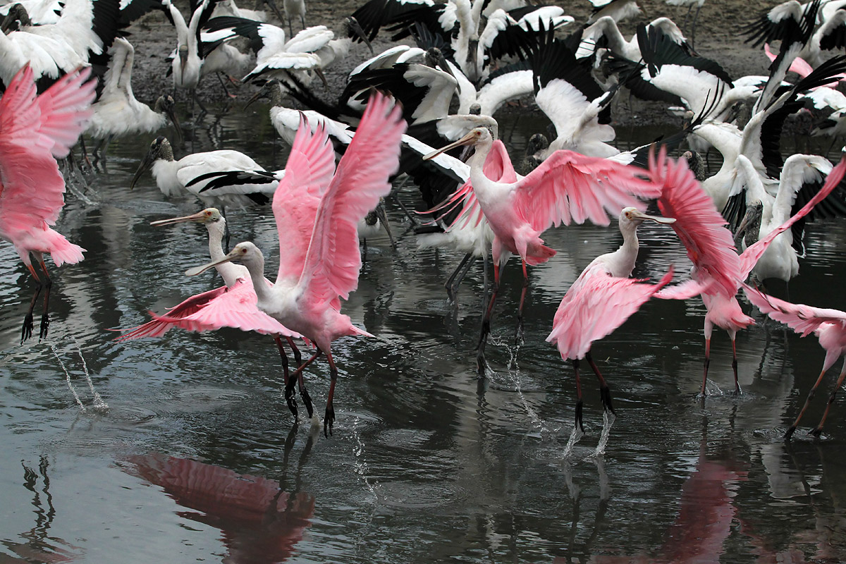 Spoonbill Wood Stork Crowd Explodes