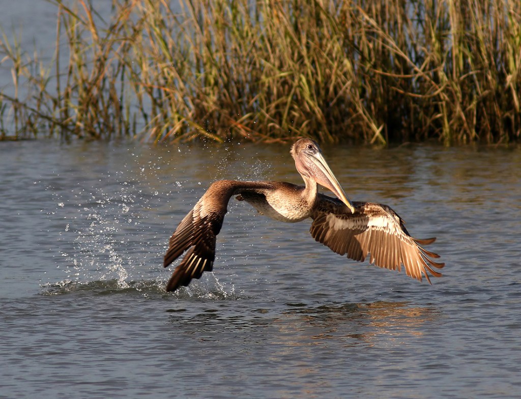 Pelican Splashing in Salt Marsh