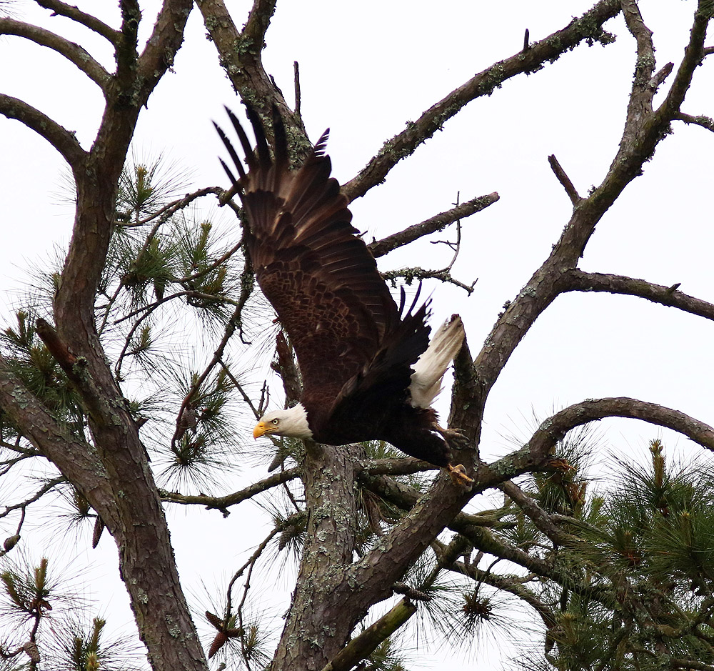 Bald Eagle Jumps Off From Pine Tree