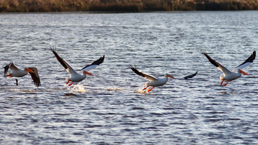 White Pelicans Cruising The Marsh Pond