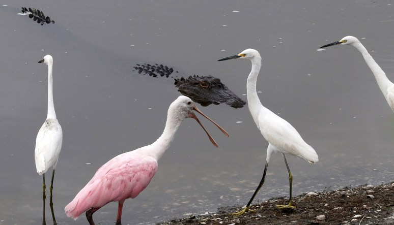 A spoonbill had joined a trio of snowy egrets when suddenly an alligator came slowly gliding in.