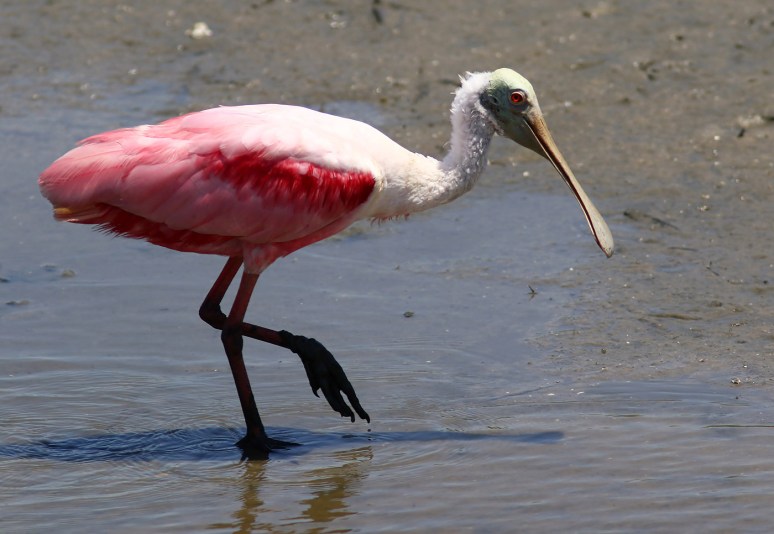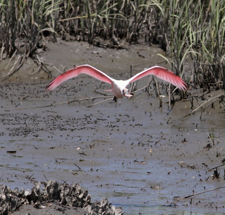 Well there were indeed several spoonbills out feeding during low tide. One of the older birds was off by himself having a delightful time scooping up numerous amounts of fish and shrimp. After a short time another younger spoonie came flying in to join the fun. That did not initially go over too well with our more mature friend who concluded it was time to express his displeasure by attempting to bite the leg of the newcomer. He just barely missed with that one, but the message was received.