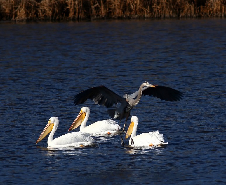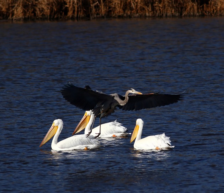 At one point, a great blue heron came gliding in and almost clipped the head of the pelican on the right.