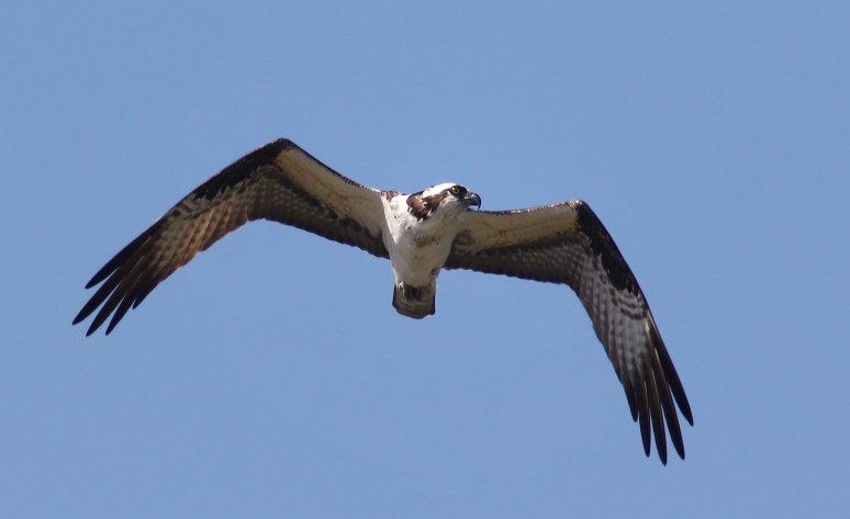 This past weekend we saw an osprey on a serious hunting expedition. You could tell he was on the hunt because he was constantly moving his eyes both side to side and downward. That is bad news for any fish that happens to be swimming in the salt marsh below. We never saw the osprey dive down and he quickly left the area heading east just a short distance toward the ocean, which should provide a tasty meal. Also notice, in the second photo, the small patch of black feathers on the top of his head. It’s not often you see the top on an osprey head while it’s flying!