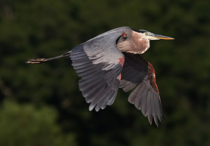 Early this morning I photographed this great blue heron flying against the trees at the edge of the marsh pond.